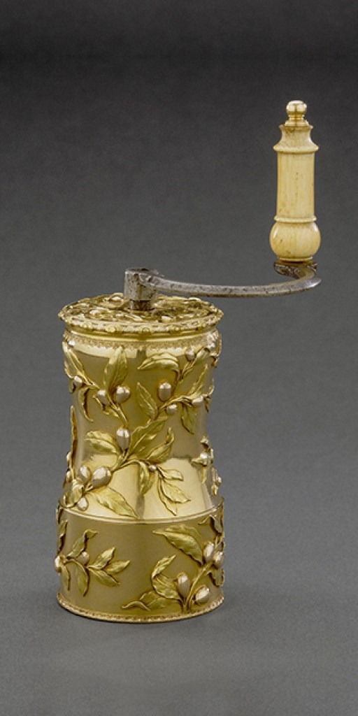 | La marquise de Pompadour avait du goût et aimait s’entourer d’objets précieux. Ce moulin à café à décor végétal en est l’illustration : l’orfèvre Jean Ducrollay l’a réalisé entre 1756 et 1757 dans le plus précieux des matériaux, l’or ! |