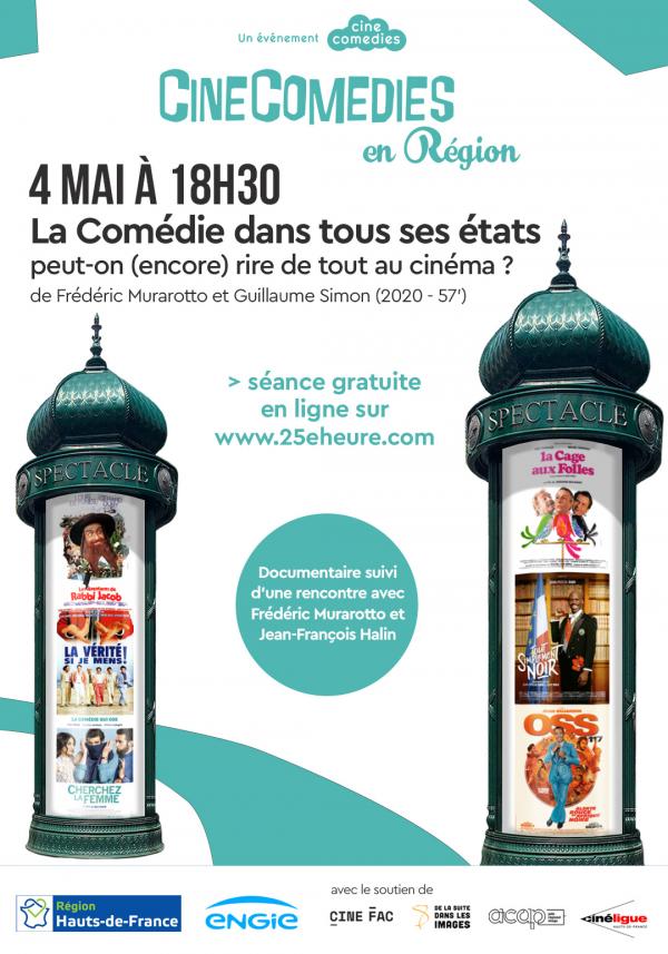 Mardi 4 mai 18h30, séance-rencontre du documentaire LA COMÉDIE DANS TOUS SES ÉTATS, peut-on (encore) rire de tout au cinéma ? avec le réalisateur Frédéric Murarotto et le scénariste Jean-François Halin, organisée par l’association Ciné Fac.