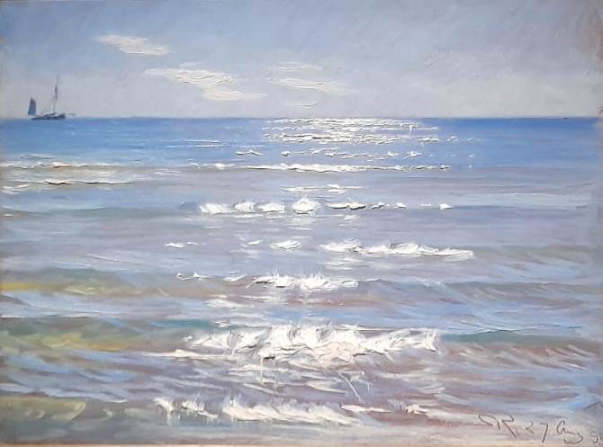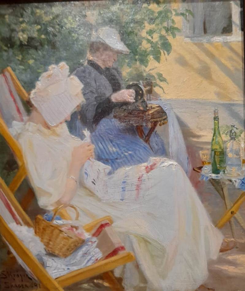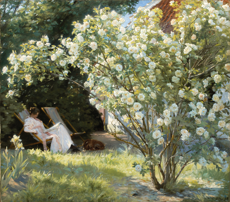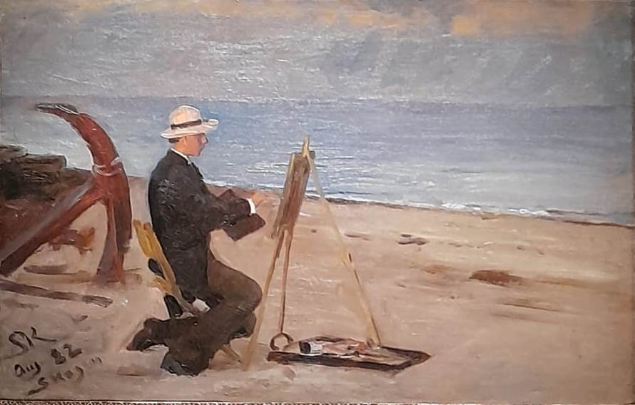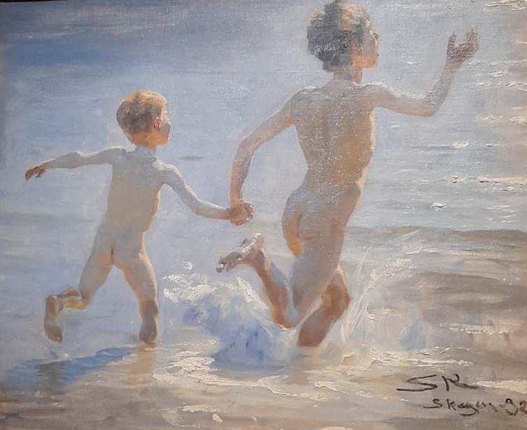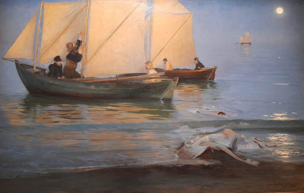 Le Musée Marmottan-Monet a rouvert ses portes sur une exposition charmante, pleine de fraîcheur, où il fait bon flâner, où l’on respire le bon air de la campagne ou du bord de mer. On doit ce plaisir à un peintre Danois, Peder Severin Kroyer. Né en Norvège en 1851, il a passé une bonne partie de sa vie dans une petite ville de l’extrême nord du Danemark, Skagen, fréquentée par plusieurs de ses amis peintres. A partir de 1882, il s’y rendait régulièrement l’été alors qu’il passait ses hivers à Copenhague. A Skagen, c’était la vie en plein air, dans son jardin fleuri ou à la plage où il fixait les couleurs changeantes du sable et de la mer (Soleil d’après-midi sur mer calme), ou la vie des pêcheurs (Bateaux de pêche), ou encore les folles baignades des enfants (Attendez nous !). Il consacrait l’hiver à une activité qui lui permettait de vivre aisément. Il peignait des personnages fortunés ou leurs enfants, comme cette délicieuse fillette, superbement apprêtée, Tove Benzon. Avant de sublimer la richesse de la nature, il s’est en effet très vite distingué par la qualité de ses portraits. A certaines périodes de sa vie, il a aussi brossé des tableaux de grande dimension dont plusieurs sont accrochés ici, destinés aux grandes expositions, notamment celles de Paris où il s’est rendu à plusieurs reprises.