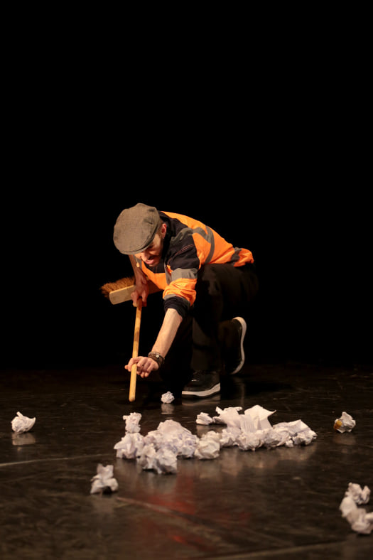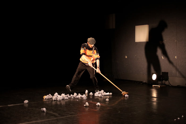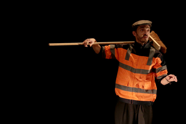 D’un côté, Céleste, balayeur élégant et intemporel, témoin bienveillant et poétique de la farce humaine, distille sa sagesse en nettoyant l’espace des scories néfastes.
