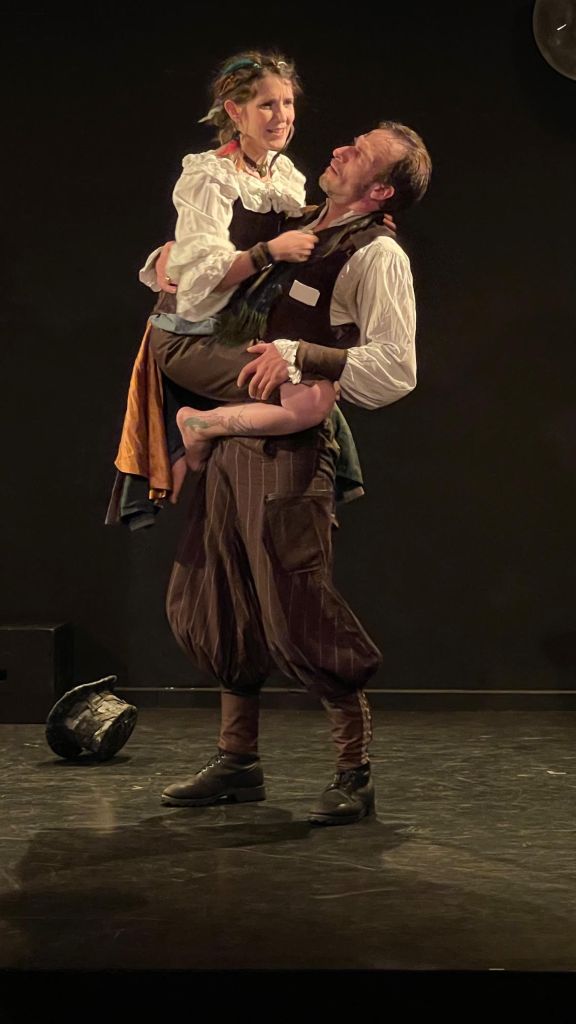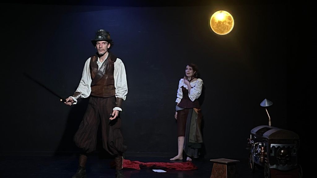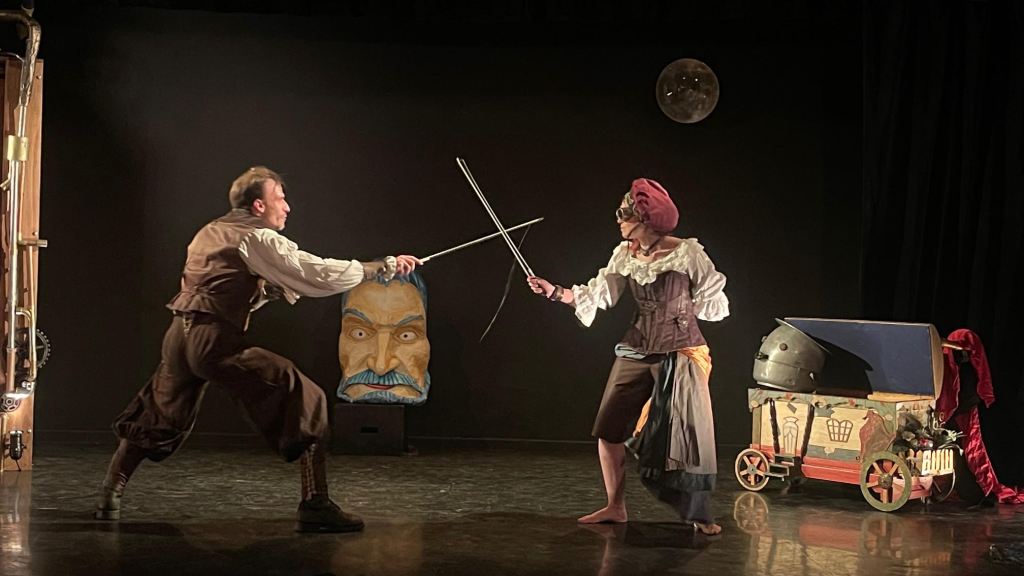 On redoute, parfois à juste titre, les œuvres « revisitées », et ce d’autant plus lorsque la pièce est un grandiose monument. Ici, Cyrano de Bergerac d’Edmond Rostand, pas moins ! Eh bien c’est bougrement réussi ! Maryan Liver et Thomas Bousquet vont, à eux deux, illustrer tous les personnages de la pièce. Les voilà virevoltant, croisant le fer,bondissant tout en gardant la poésie et la force du texte. Ils nous font souvent rire et nous émeuvent parfois.