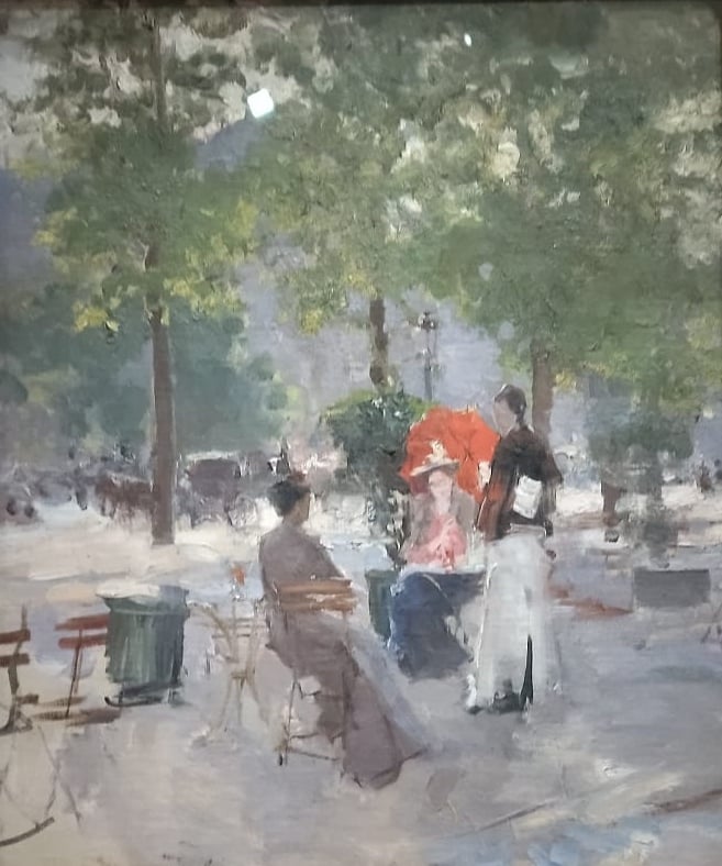 A l’entrée, nous sommes accueillis par une galerie de portraits, ceux des frères Morozov qui, bien que jeunes, nous frappent par leur prestance, et ceux de leur famille, de leurs amis et de quelques importants mécènes. Suit un espace où sont accrochées les acquisitions pionnières qui ont orienté leur collection. On suit ainsi la démarche audacieuse des deux frères qui n’hésitent pas à faire entrer pour la première fois en Russie Edouard Manet (Le Bouchon, 1900) et Pablo Picasso (Les deux Saltimbanques,1908), mais qui font en même temps des choix judicieux de toiles de peintres russes qui vont eux aussi découvrir l’art moderne et, pour certains, Paris ! (Konstantine Korovine, Un Café à Paris, 1890) On doit à Michail la découverte de l’œuvre de Bonnard. A sa suite Ivan va donner libre cours à son coup de foudre pour ce peintre. Il ne se contente pas d’acquérir huit de ses toiles, mais il commandera cinq œuvres monumentales pour la décoration de son hôtel particulier. Entre 1910 et 1912 arrive ainsi un triptyque, La Méditerranée, complété par deux grands panneaux, Le Printemps et L’Automne, disposés de part et d’autre. Grands amateurs de paysages, on mesure leur passion par la réunion dans une même salle de toiles de ce thème traité par Monet, Sisley, Pissaro ou Renoir.