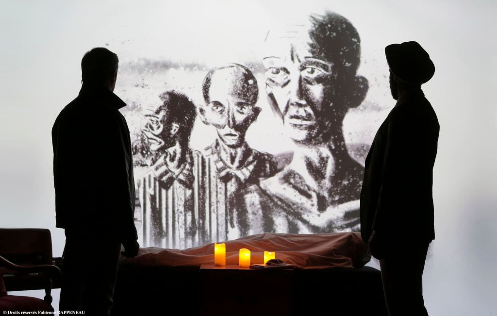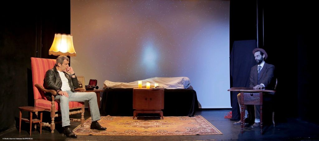 Cette pièce, bouleversante, permet à l’auteur d’imaginer un dialogue fictif de questions-réponses entre lui et lui. Il se met lui-même en scène, dans la peau de Srul, avec son petit costume, son petit chapeau façon Yiddish accompagné de Jean-Philippe Bêche, Pierre, en mec nature, jeans et blouson. Le duo fonctionne à merveille, il nous fait parfois rire avec son humour juif, et nous émeut profondément lorsqu’est évoquée la Shoah.