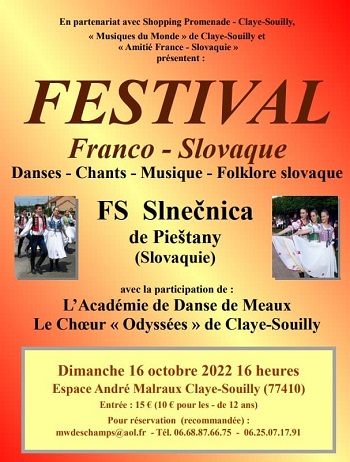 En cette année 2022, la manifestation est consacrée à la Slovaquie, pays aux richesses fabuleuses. Un spectacle de danses et de chants sera proposé au public avec le groupe folklorique FS Slnečnica de Piešťany. L’Académie de Danse de Meaux et le Chœur « Odyssées » de Claye-Souilly sont également au programme.