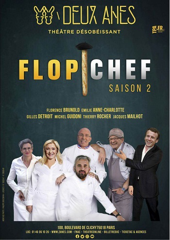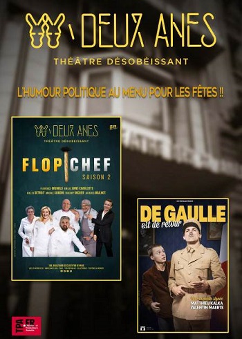 A l’occasion des fêtes de fin d’année, le public du théâtre des DEUX ÂNES aura doublement l’occasion de rire des politiques avec FLOP CHEF, la nouvelle revue menée par Jacques Mailhot et la troupe des chansonniers (Michel Guidoni, Florence Brunold, Gilles Détroit, Thierry Rocher, Émilie Anne-Charlotte) et aussi avec DE GAULLE EST DE RETOUR, une comédie jouée plus de 500 fois en France et la première fois à Paris.