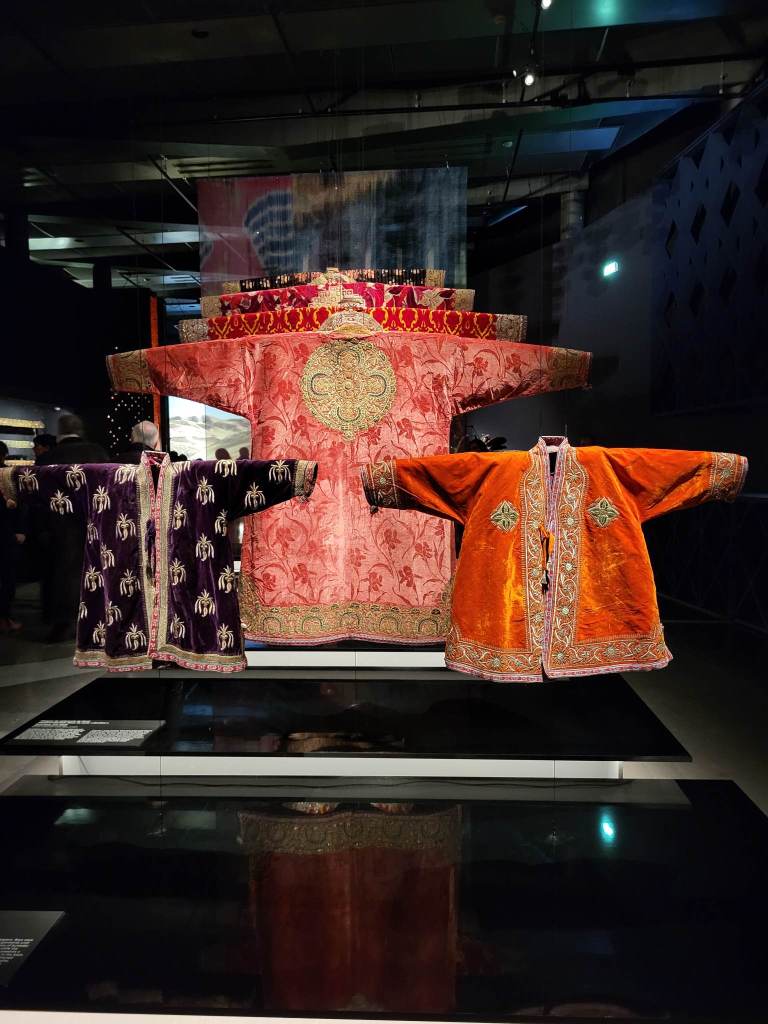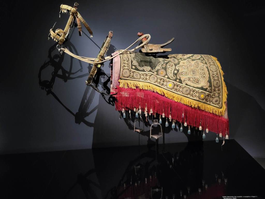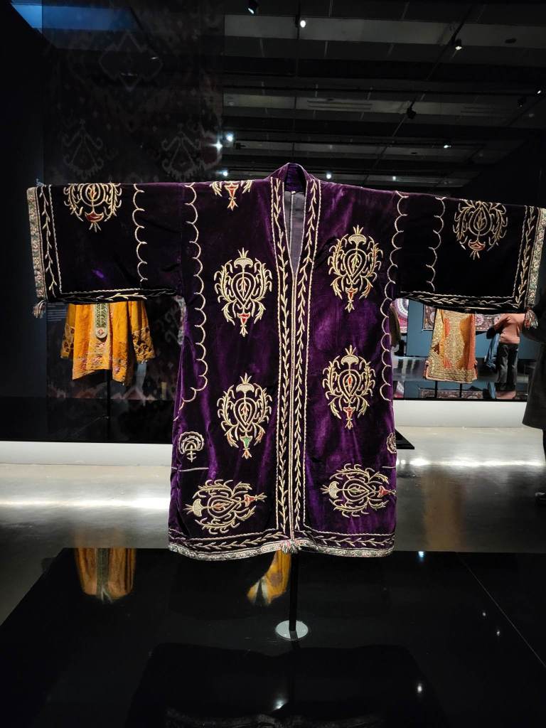 Pendant votre visite vous découvrirez des Somptueux manteaux chapans et accessoires brodés d’or de la cour de l’Émir, selles en bois peintes, harnachements de chevaux en argent sertis de turquoises, précieuses tentures brodées suzanis, tapis, ikats de soie, bijoux et costumes de la culture nomade ainsi qu’une quinzaine de peintures orientalistes : au fil d’un parcours déployé sur plus de 1100 m² se déploient près de 300 pièces inédites, représentatives des trésors de l’Ouzbékistan.