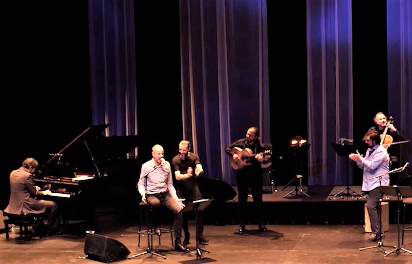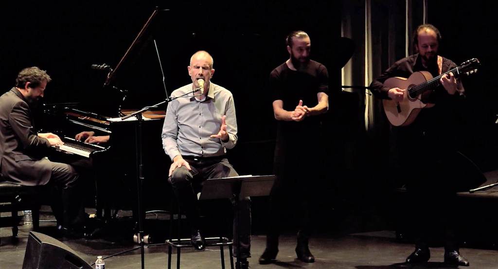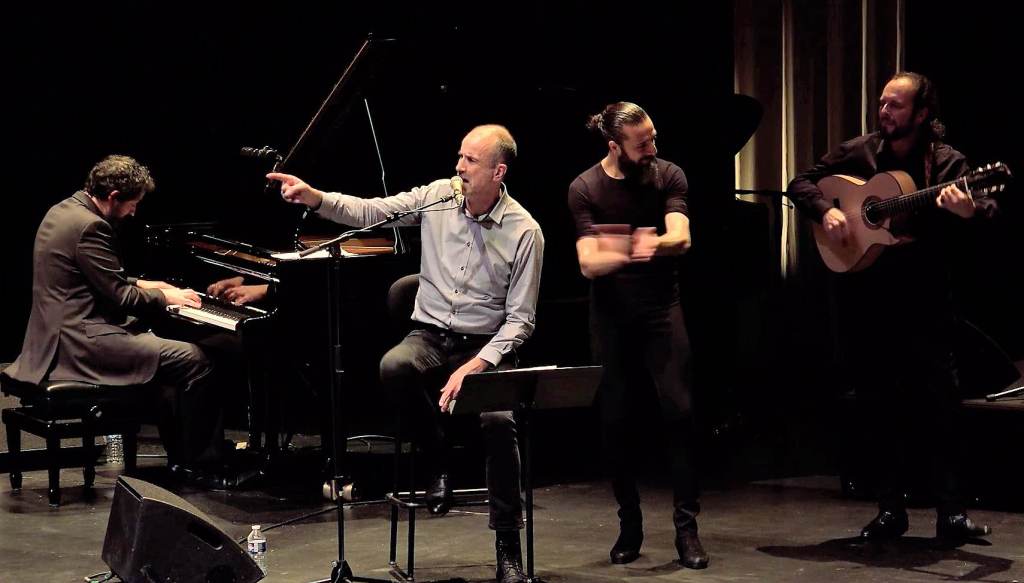 Un spectacle absolument hors du commun ! Quatre musiciens de très grand talent vont être sur scène pendant plus d’une heure pour nous faire découvrir des flamencos mêlés de sonorités de jazz d’une grande originalité. L’Antonio Placer Quartet Trovaores nous régale de chansons, de danses et de musiques comme on en a rarement entendu. Antonio Placer (auteur, compositeur, directeur artistique et chanteur) est accompagné de Javier Rivera, (chanteur flamenco et palmas), Juan Antonio Suarez dit « Canito » (guitariste) et Abel Harana (danseur flamenco et palmas). Nous avons retenu, entre autres, la virtuosité du guitariste, les belles voix des deux chanteurs et l’agilité du jeune danseur de flamenco et ses « zapateados y taconeos » endiablés. Certaines chansons, fougueuses et passionnées, nous prennent aux tripes et nous remuent au plus profond de nous-même.