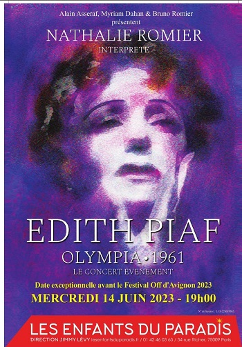 C’est en 1961 qu’Édith Piaf s’est produite pour la dernière fois. C’était sur la scène de l’Olympia. Nathalie Romier rend hommage à cette grande figure emblématique de la chanson française en faisant revivre ce concert. Elle interprète les mêmes chansons, dans le même décor, portant la même petite robe noire, avec une voix confondante. Sans tenter de l’imiter, elle restitue la voix envoutante, qui nous prenait aux tripes, de cette immense artiste. Nathalie Romier a réalisé ici un spectacle exceptionnel dont elle a elle-même assuré la mise scène. Elle nous bouleverse comme nous l’étions lors des récitals d’Edith Piaf.