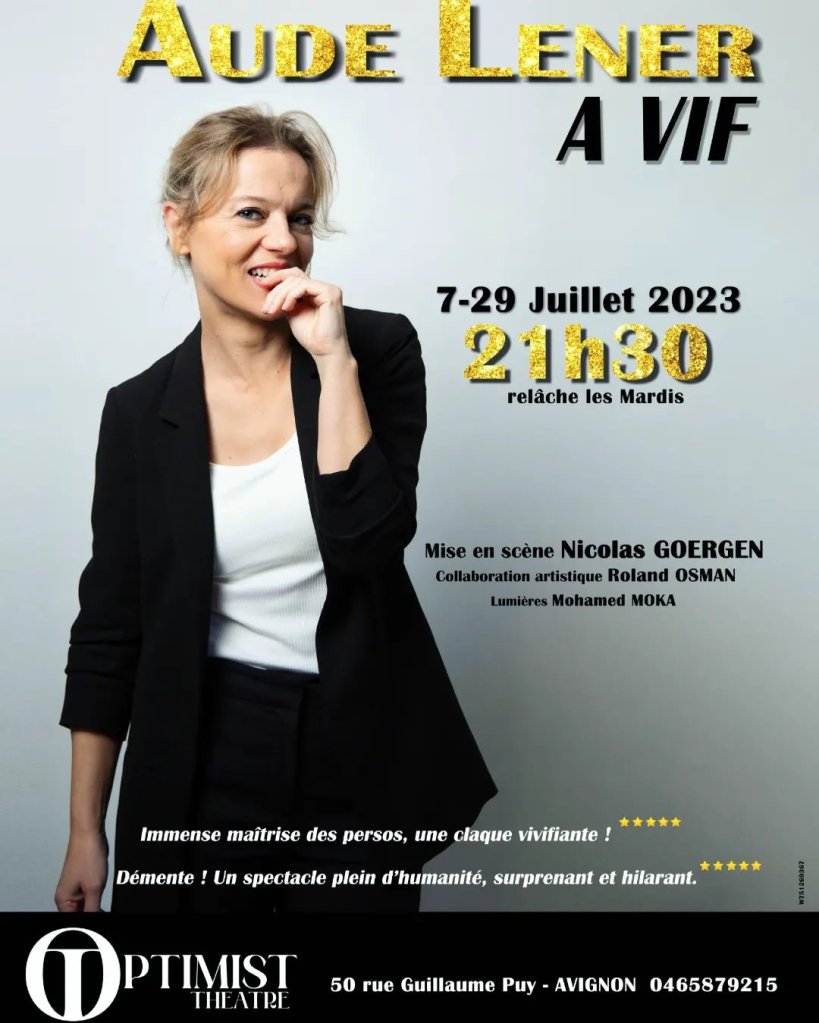 Dans un one-woman-show très vivant, Aude raconte les péripéties d’une mère de famille comédienne, ses joies, ses colères, le bonheur d ‘être mère, la séparation avec son fils qu’elle aurait souhaitée garder plus longtemps auprès d’elle…Elle campe à merveille une galerie de personnages, loufoques, tendres, poétiques, qui nous rendent visite, impromptus, au détour d’une inflexion de voix, d’une nouvelle posture, d’une gestuelle qui croquent avec précision le personnage.