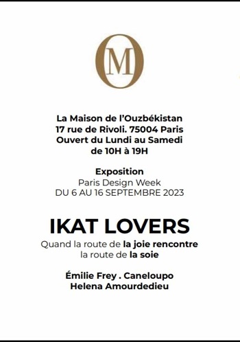 Dans le cadre de la Paris Design Week, La Maison de l’Ouzbékistan présente une magnifique exposition pour inaugurer un cycle de rencontres créatives et audacieuses entre les routes des savoir-faire soyeux de l’Asie Centrale et ses interprétations contemporaines. L’éclat des couleurs et la singularité des motifs abstraits de l’Ikat de la vallée du Ferghana (vallée fertile couvrant l’est de l’Ouzbékistan, le sud du Kirghizistan et le nord du Tadjikistan) sont magnifiés par le talent de la métamorphose des objets réalisés avec art par Émilie Frey, abat-jouriste et Helena Amourdedieu, tapissière.