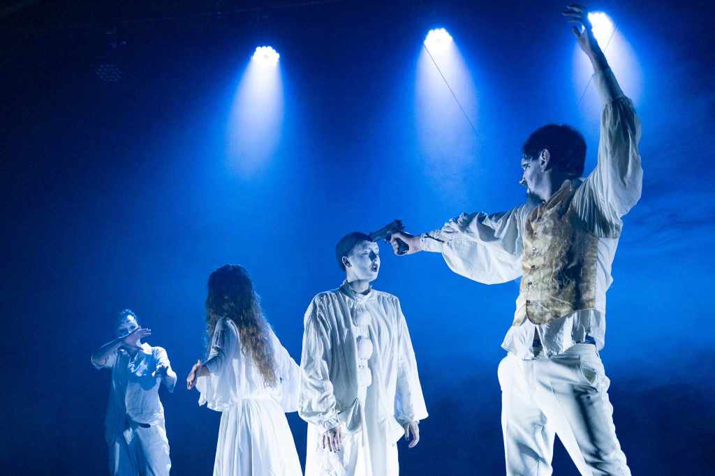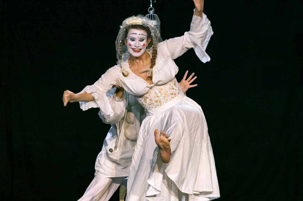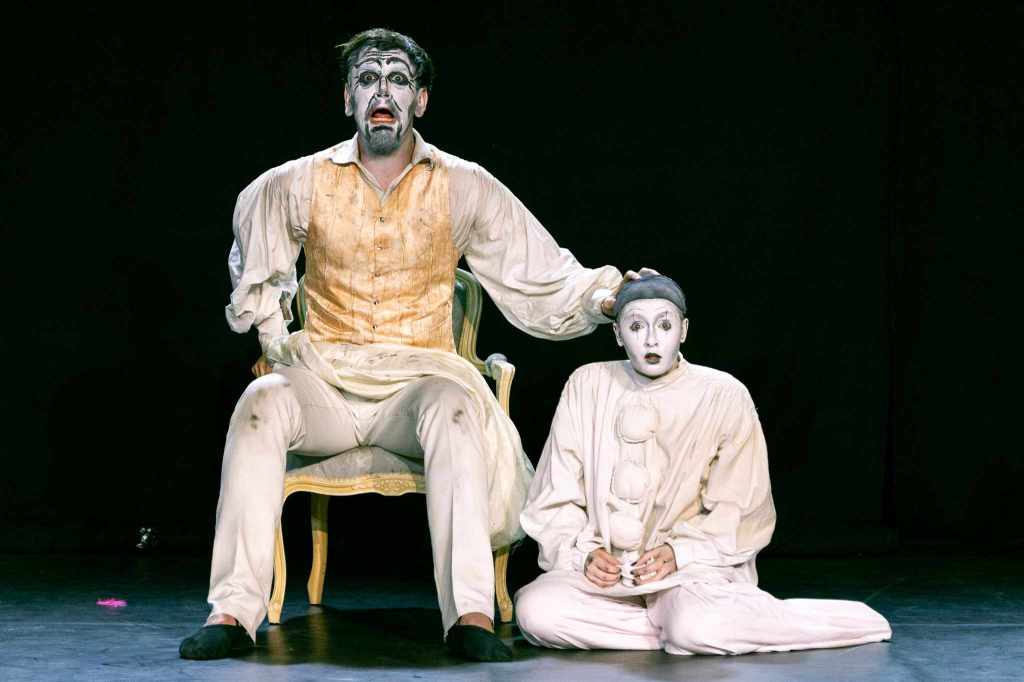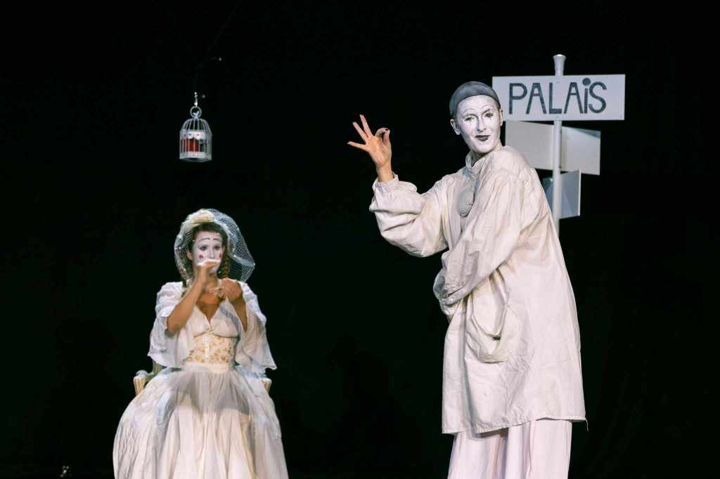 Un personnage joue en clown, ( oiseau), Pierrot en mime, et les autres simplement maquillés, mais dans un jeu rappelant la comedia del arte.