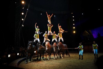 – Un spectacle musical équestre et aérien : une production d’un nouveau genre où la magie de l’art équestre se mêle aux exploits des tableaux saltimbanques avec en point d’honneur la Grande Poste, inégalée et unique au monde.