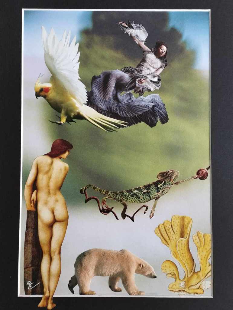 Mon travail sur le collage a commencé lors du premier confinement en 2020. L’isolement forcé me laissait place à la rêverie, au besoin d’exprimer une pensée parfois furtive, un désir d’évasion dans l’imaginaire. J’aime observer les images et l’idée de leur faire prendre une autre signification au-delà de leur contexte premier est née.