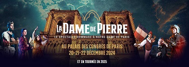 Avec la Dame de Pierre, plus d’une centaine d’artistes vous plongeront au cœur de l’histoire de Notre-Dame de Paris, par un spectacle époustouflant au Palais des Congrés à Paris les 20 et 21 décembre 2024.