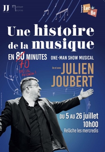 Julien Joubert seul en scène durant une heure dix relate l’histoire de la musique depuis les hommes préhistoriques jusqu’à nos jours .