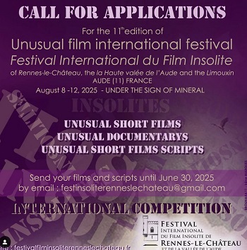 Créé en 2015 par les comédiens Fanny Bastien et Geoffroy Thiebaut, le Festival International du Film Insolite de Rennes-le-Château met en valeur le patrimoine culturel et la biodiversité de la Haute Vallée de l’Aude et du Limouxin à travers des événements singuliers programmés dans des lieux chargés d’histoire : projections de longs métrages de fiction hors compétition, de courts métrages et documentaires en compétition, concours de scénarios, masterclasses et tables rondes, expositions, dégustations de produits locaux, pétanque insolite… dans un esprit à la fois festif et profondément culturel.