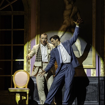 Au cœur du spectacle, Laurent Lafitte livre une composition remarquable en Albin/Zaza. Digne héritier de Michel Serrault, il est absolument hilarant quand il fait le show dans ses superbes robes, ses plumes et ses paillettes ou bien quand il descends dans le public pour invectiver les spectateurs des premiers rangs. Mais au-delà de la performance flamboyante, c’est la finesse de son jeu qui impressionne. Sensible, fragile, d’une précision comique redoutable, Laurent Lafitte déploie toute sa palette de comédien : un regard, un silence, un léger décalage suffisent à faire surgir une émotion. Son sens du timing, ses mimiques, la justesse de ses silences font des merveilles. Son interprétation de « J’ai le droit d’être moi » sonne comme un cri de survie, intime et bouleversant. Face à lui, Damien Bigourdan campe un Georges élégant et nuancé. Voix chaleureuse, jeu tout en retenue, il incarne avec justesse cet homme aimant, parfois lâche, mais profondément humain. Leur duo incarne une histoire d’amour construite dans le temps, durable, faite de compromis et de tendresse.