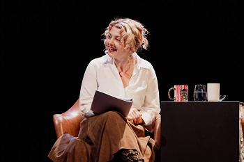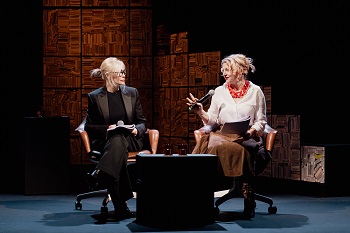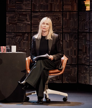 Le dispositif scénique est d’une grande sobriété. Un plateau de télévision où trône une table, deux fauteuils, et deux verres de vin blanc « hors caméra ». En arrière-plan, une impressionnante construction de livres forme une sorte de tour vertigineuse, métaphore transparente mais efficace d’un savoir qui protège autant qu’il enferme. Durant une heure quinze, c’est là que se tient l’autrice retranchée dans la rigueur de sa pensée, tandis que la journaliste tente de la bousculer.