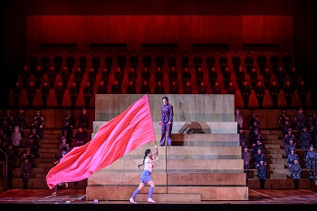 La scénographie déploie des images fortes. Dès les premières mesures de l’œuvre, un aigle gris métallique surgit des cintres -une évocation stylisée d’Air Force One-qui fera plus tard face à un immense dragon rouge en tissu aussi vibrant qu’expressif. Deux emblèmes, deux puissances, deux visions du monde. Toujours sur l’acte 1, lors de l’entretien entre Nixon et Mao, la scène se déploie verticalement : à l’étage, une bibliothèque solennelle chargée d’ouvrages ; en contrebas, un sous-sol où ouvrages brûlés et prisonniers torturés rappellent l’envers du décor idéologique et la violence du pouvoir.