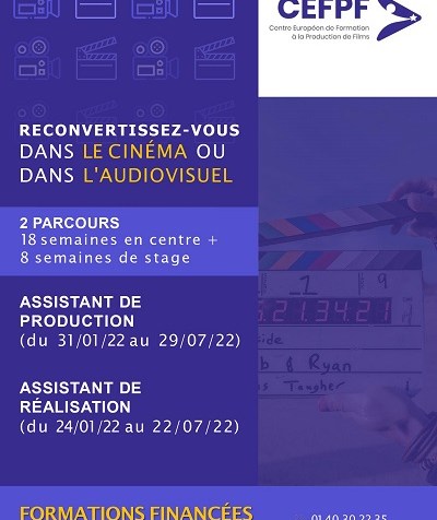 Reconvertissez -vous dans le cinéma ou dans l’audiovisuel. Cette formation se fait en 2 parcours : 18 semaines en centre plus 8 semaines se stage. La formation est financé par … Continuer la lecture de Centre Européen de formation à la production de films.